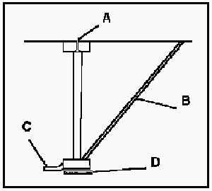 The braces, B in the illustration, are gone, right? And the lyre gently swings back and forth in the breeze as you push the pedals. You MUST get a brace arrangement at once, or serious damage will result to the lyre. You have two choices for the braces. Either get two wood dowels at the hardware store, or order the brass braces from our Online Catalog. There are two lengths available. Be sure to determine the length which is nearest to yours by measuring from holes to holes.