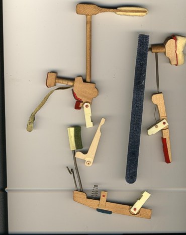 During the 1950s a number of companies made pianos using plastic parts. It seemed like a great idea, but they had no way of knowing what would happen to those parts over time. Soy bean plastic from the 1950s crystallized in about 10 to 30 years. Some parts lasted longer for some reason, and tuners are still replacing them. The most commonly used plastic item was the elbows at the bottom end of drop action wires (see diagram pages). However; many other action parts were plastic. A little later in this chapter you see a section on Vagias elbow repair.