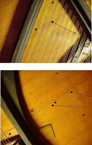 Filling Cracks in Sound Boards Repairing the sound board from the back is essential, and filling the crack from above will not be enough alone to secure the sound board and stop the buzzing. Once the process above is complete, you may want to fill the cracks on the top side of the board for cosmetic purposes. To accomplish this you must be doing a complete restoration and removing the harp for restringing. Once the harp is removed, you must deepen the grooves where the cracks are. Two "V" shaped tools are available, and either will work. The one with tools on each end and a handle in the middle has the most options for work. See this catalog page for sound board repair items. The groove made by the tool is "V" shaped. This groove will then receive a spruce shim which is shaped the same way. Elmer's Carpenter's Glue must be used, and the spruce shim is tapped into the "V" groove and allowed to dry. The chisel end of the tool is then used to trim the excess of the spruce shim down level with the sound board You must avoid getting into the sound board Some very modest sanding is in order as a last step, and the sound board should then be lightly sanded and a coat of varnish or lacquer added.