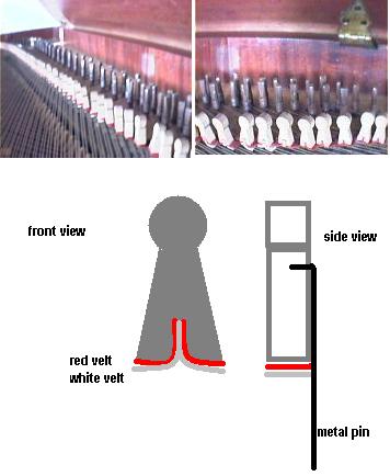 You will need to remove the action as instructed in Chapter Five, and you should find a way to remove the lower end of the damper wires inside and in the rear of the action cavity. There will probably be a set screw holding the wire in a wood damper action assembly. Remove them all, and you will need to add felt to the dampers. This felt may be soft, but it should be thin I gather. Modern damper felt is very thick. There has to be a kind of felt we have which can be cobbled into the need to work.