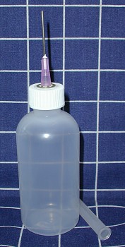 Hypodermic type needle on 2 ounce plastic bottle--