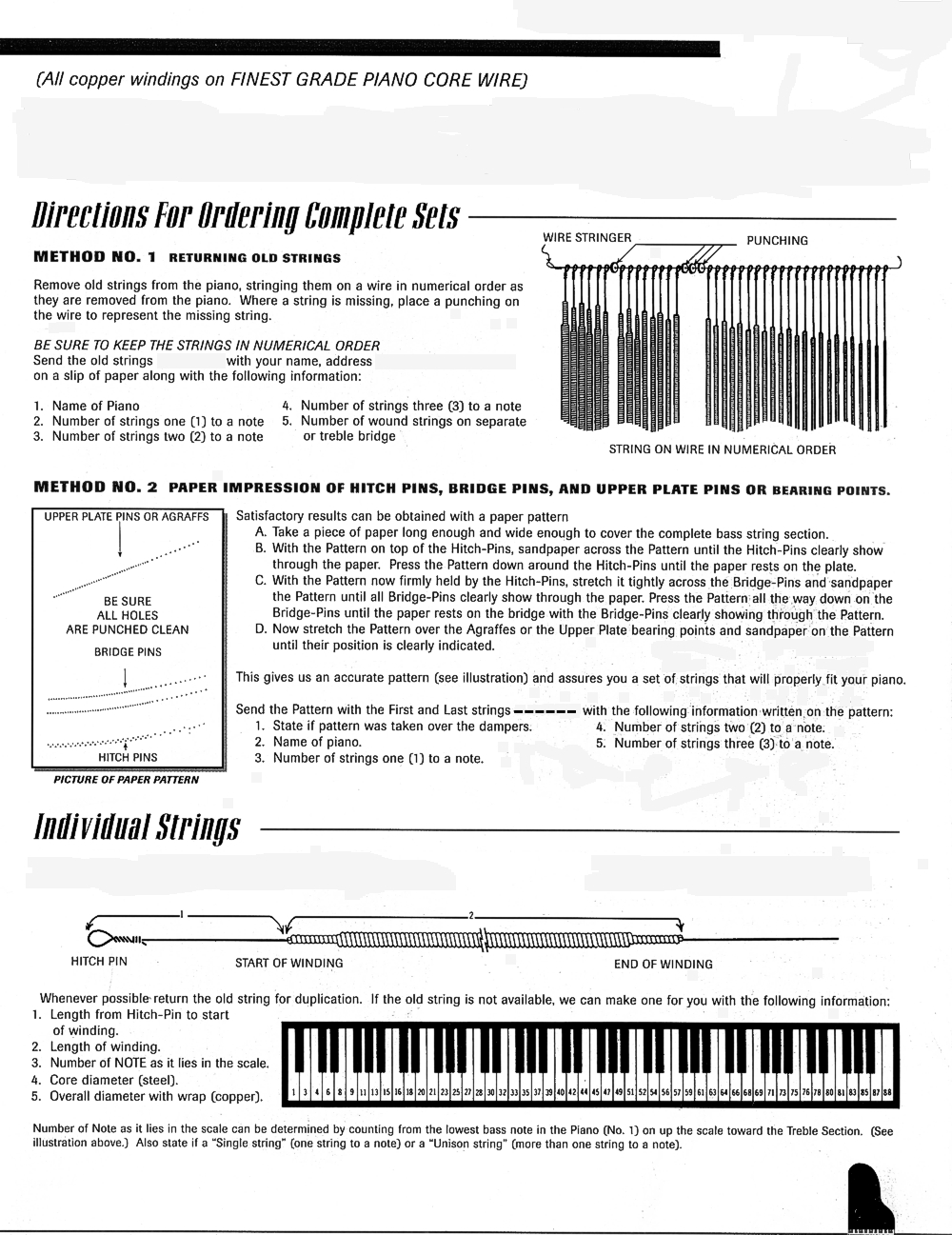 When ordering sets of bass strings made to order it is always helpful if the manufacturer's name and serial number of the piano is given. Be aware that the brand name (such as Baldwin, Kimball, Aeolian, etc) may not be the same as the trade name on the fall board. Try to find the actual company name under the lid or on the harp. This information is very useful even if the strings or a pattern are sent. Production time can be reduced considerably if the string maker can refer to his personal file and notes on various brands of pianos.