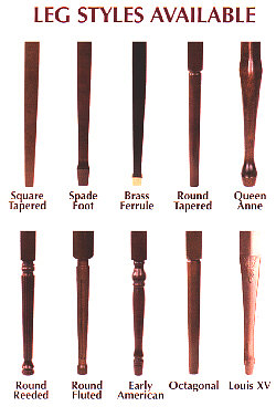 J1 Lathe Turned Round Leg J2 Square Tapered Leg with Ferrule J3 Spade Leg (Traditional) J4 Square tapered Leg without Ferrule J5 Queen Anne Leg J6 Round Reeded Leg J7 Louis XV Leg J8 Round Fluted Leg J9 Octagonal Spade Leg