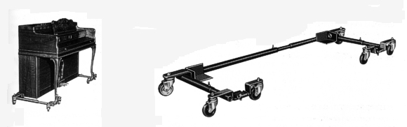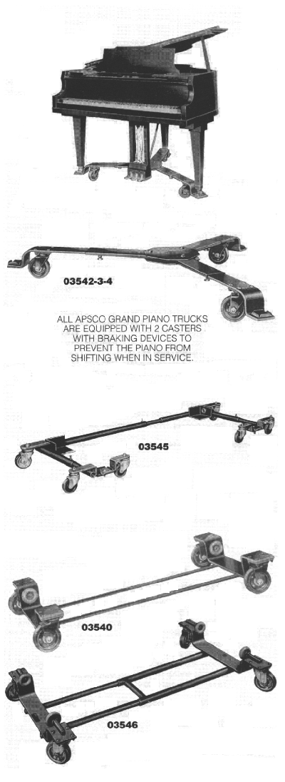 | Piano legs and cabinets suffer greatly from rolling them here and there on the original casters, not to mention to your floor. A piano rolled on carpet can raise a wave in front of the wheel as it moves along, and if it catches on the wave, the carpet will fold, and the wheel can easily rip the carpet. Also, the tune is easily lost at door jams and rough spots. A grand piano should never be rolled around on its original wheels. A caster can catch, and the leg will easily rupture, even dropping the piano. Beyond this, a run away piano, or a piano which tips over, can cause injury which can be far more costly in insurance claims than the cost of one of these trucks. Think about it. Look